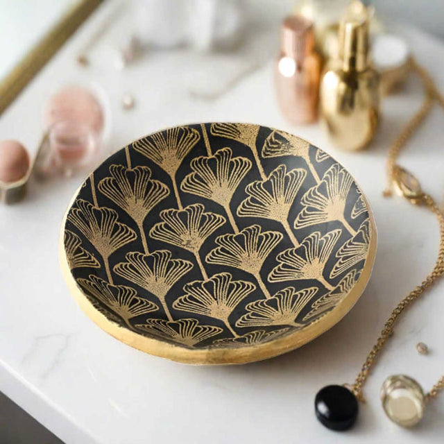 Step back in time with our latest trinket dish, handmade from polymer clay with an intricate hand painted gold art deco design.